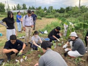<p style=”text-indent: 1em;”>その後、農園デザインの検討を行い、複数の植物を組み合わせた生態系モデルの構築に向けたアイデアを共有。続いて、参加者全員で畝立てに取り組み、一部区画には果樹や苗、種の植え付けを実施しました。