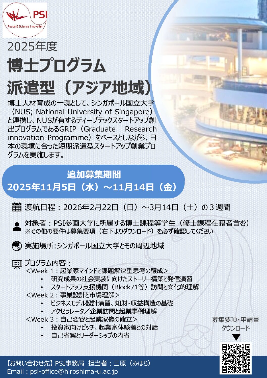 募集期間延長【学内締切:10/22(水)正午】2025年度 PSI博士プログラム(派遣型・アジア地域)募集